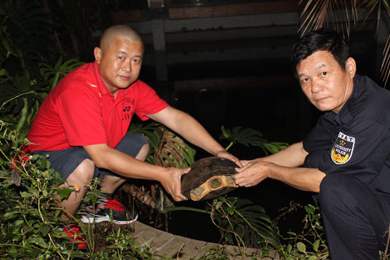 2012年4月9日下午5点,我处海甸校区值班室接同学报警救助称:在校园附近捡到一只大乌龟,不知如何处理。我处领导迅速派出民警到第一食堂与报警人联系,看到学生捡到一只重约10公斤的乌龟,乌龟外壳上还刻了一些字,为了让这只“迷路”的乌龟安全“回家”,我处民警急忙为其找“新家”,最后确定将乌龟放在校内一安全地点,看见乌龟在水里愉快地游动,民警心中一块石头终于落地了。