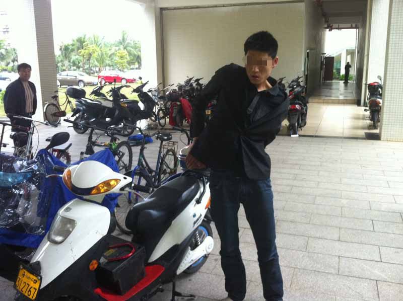 我处2012年12月1日晚在16号楼抓获盗窃嫌疑人林某帝(男、海南澄迈人,吸毒人员),移交人民路所后因身体有病无法关押,释放后,嫌疑人林某帝不思悔改,于2012年12月5日下午再次窜到我校五号教学楼盗窃一辆电动车和电动车电池时被守候的“猎鹰”队员抓获,现场缴获被盗电动车一辆、电池一块和作案工具若干。