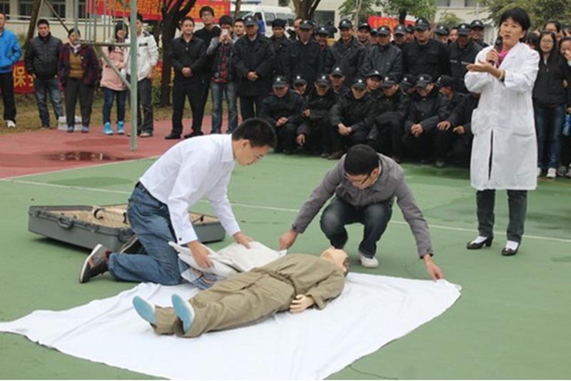 第二环节,如何对受伤人员进行救护。由医院张素丽医生带领应急小分队现场示范进行人口呼吸、心肺复苏等救护技能。