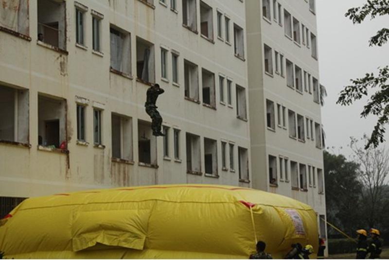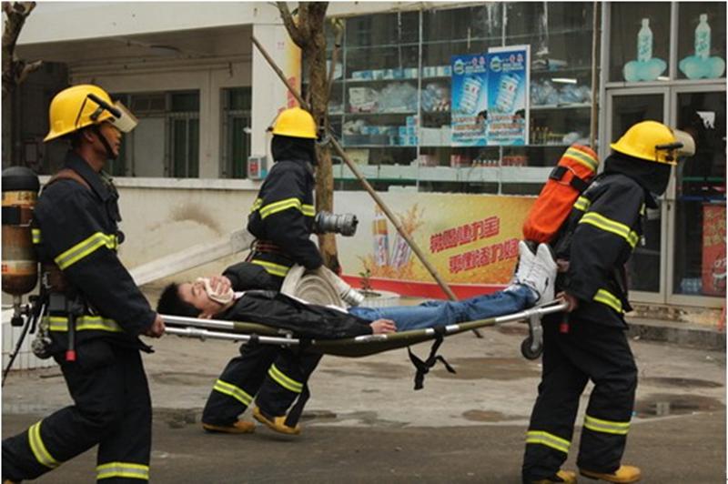 第一环节,A9宿舍区内因同学使用大功率电器引发火灾,紧急疏散逃生演练开始。在演练中,模拟进行初步救援处理、向消防指挥中心报告、急救中心发出救援电话、成立现场灭火指挥部、设置现场临时指挥点等内容。消防队接到火警电话后消防车迅速向A9公寓驶来,水闸随即打开,救生充气垫也立马展开。在指挥人有条不紊的指挥下,消防人员依次将被困同学救出,精湛熟练的技术博得了在场观众的热烈掌声。