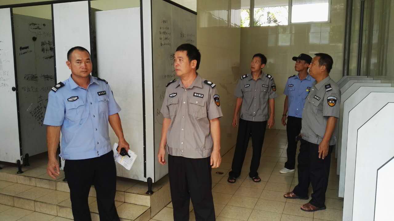 校卫队员协助师生事务保障中心做好教学楼卫生间的清扫工作,为师生服务