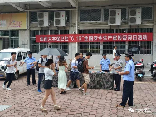 保卫处全体党员干部和校卫队员紧紧围绕“生命至上、安全发展”主题,开展2018年“安全生产月”活动。抓好校园治安安全、交通安全、消防安全等工作,向师生员工开展安全生产宣传教育和安全知识咨询服务,弘扬安全文化,普及安全知识,提升安全素质,提高广大师生自我防范和自救互救能力,预防和减少安全事故发生,确保校园的安全稳定。//www.hainanu.edu.cn
