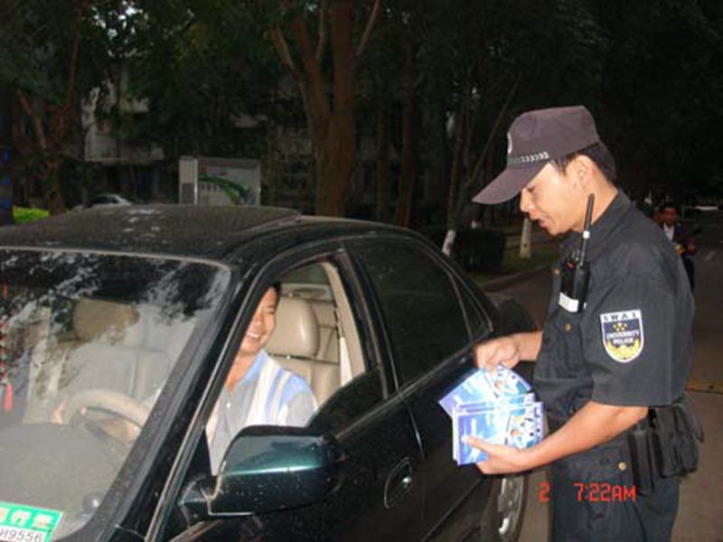 “尊敬的老师、司机朋友,欢迎您进出入我校校园。为保障您的交通安全,请遵守校园交通提示,请认真阅读交通安全指南及温馨提示,……”。2009年11月2日清晨6点整,天尚蒙蒙亮,且带着阵阵狂风和一丝丝凉意,一颗颗警徽依旧闪耀在我校区门岗上,耐心、细致的给进出入我校园的车辆发放和讲解《海口市道路交通安全服务指南》及“PA官方网站保卫关于校园交通安全温馨提示”。这是我处在近期进一步加强整顿校园交通环境,确保校园治安井然有序,维护良好的校园交通秩序及行车安全、主干道上交通畅通,提高校园交通文明、安全的意识,积极给予广大师生提供的一项校园交通便 民服务的举措。
