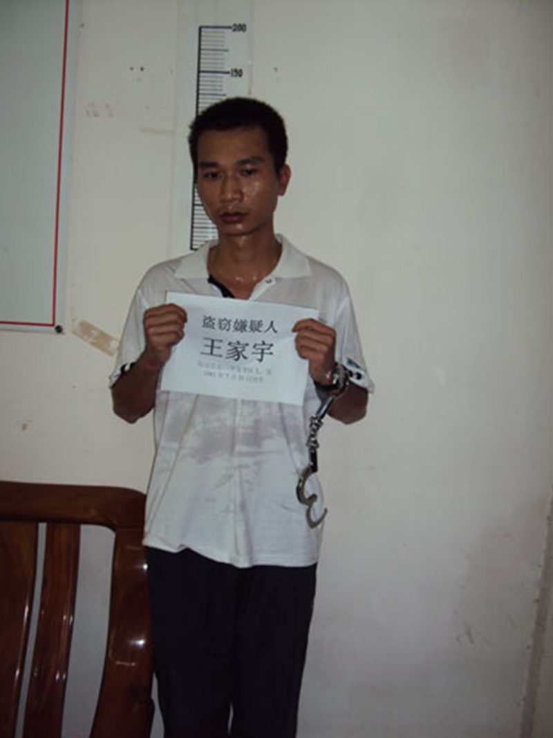 2010年5月5日中午13时10分左右,在PA官方网站三号教学楼执行守候任务的民警发现有一名男子(王家宇,男,1981年7月31日生、海口龙华区人、身高1.81米、退伍军人)行踪可疑,欲对其进行盘查,嫌疑人撒腿就跑,我处民警追赶后将其抓获,当场在其身上发现4月28日在四号教学楼104室的盗窃学生手机MOBA牌手机一部,还有两张在鑫宇典当有限责任公司的当票。经审讯,王家宇供认其从部队退伍后染上了毒瘾,便开始贩毒,从2009年起便开始在海口各高校作案,总数达数十起,其作案手法是在图书馆、教学楼或学生宿舍等公共部位,趁同学们中午自习午休或在宿舍中午休息不关门之机,顺手牵羊将同学们的随身贵重物品盗走。