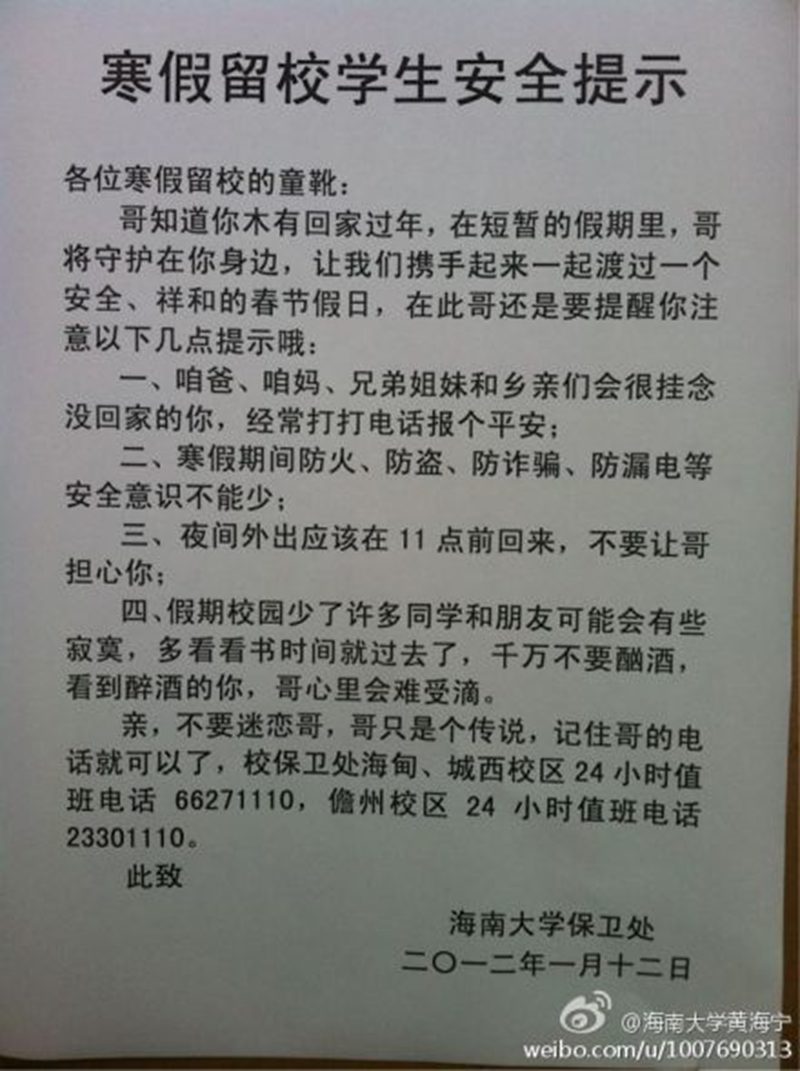 为了加强寒假期间校园安全管理,保证上千名过年不回家同学的安全,我处在三个校区部署了充足的警力,加大巡逻密度。同时为增强同学们的安全意识,我处用学生喜闻乐见的方式在保卫处网站、新浪微博、腾讯微博上发布了“寒假留校学生安全提示”,并在三个校区张贴,许多网友和同学纷纷对这种安全教育方式赞不绝口。