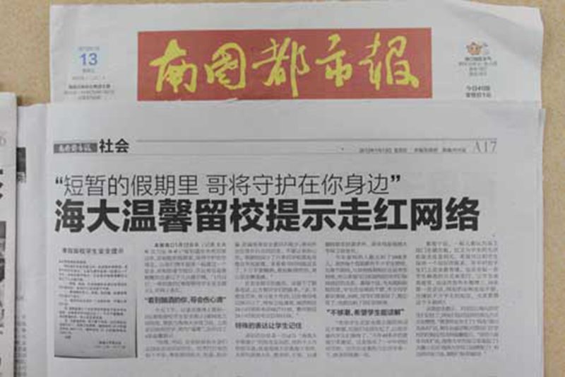 2012年1月13日出版的《南国都市报》详细报道了我处公布的“寒假留校学生安全提示”,各网站也纷纷转载,在社会引起了较好的反响。