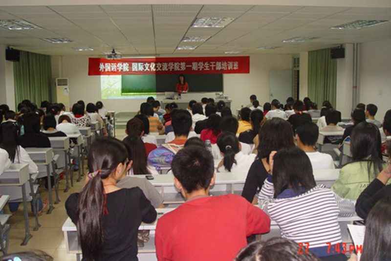 3月27日晚,外国语学院与国际文化交流学院第一届学生干部培训班在旅游学院L3—303隆重举行。出席开幕式的有校保卫处黄海宁处长,外国语学院党委黄丽芹副书记、学工办罗国忠、李翠霞老师,国际文化交流学院学工办王华老师,以及两个学院的团委、学生会干部及各班班委的全体学生干部。外国语学院党委副书记黄丽芹致开幕辞,她阐述了学生干部在学院、学校的学生工作中所发挥的重要作用及对学生干部培训的紧迫性。她强调指出,学生干部是学生的一员,更是学生的领军人物,学生的楷模。因此,很多时候,人们把高校学生干部的素质和能力做为衡量高校教育水平和效果的标准之一。要提高学生干部的综合素质,必须加强理论学习,提高实践能力。理论学习主要是通过培训及自习,实践能力的培养主要是通过开展各种活动来提高。本次的培训活动主要有六次讲座及一些学习活动。