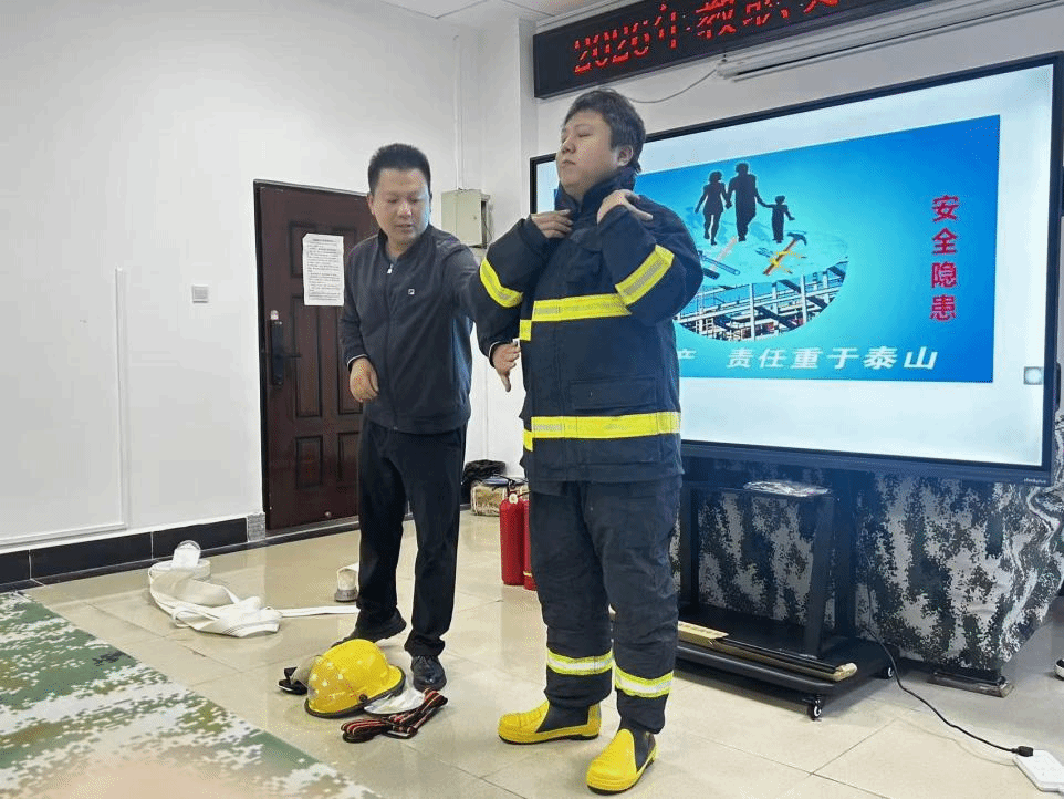 理论学习结束后,安全科罗钦老师为参训人员演示了消防战斗服、防护头盔、消防靴等应急防护装备与灭火器材的正确使用方法和注意事项。