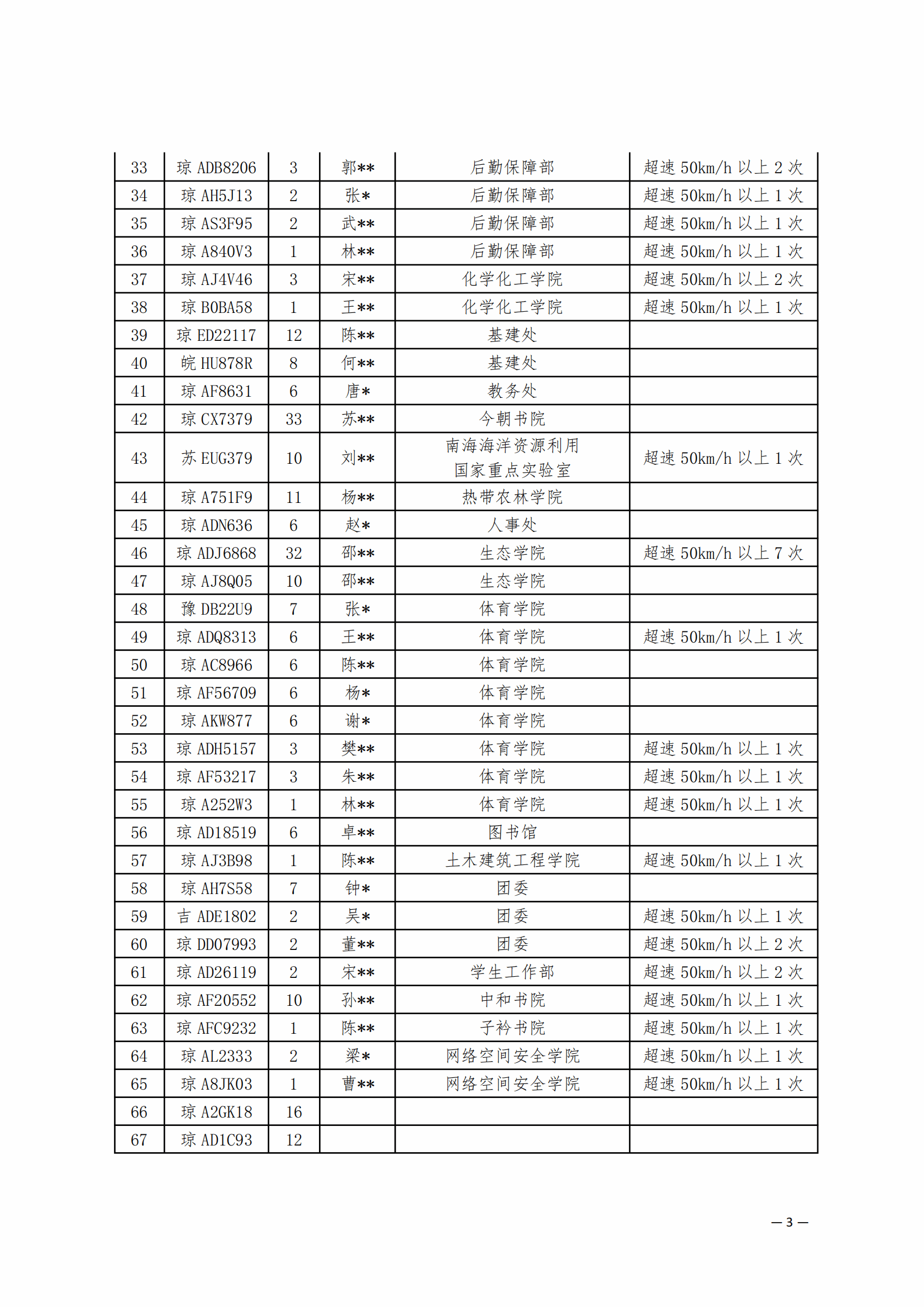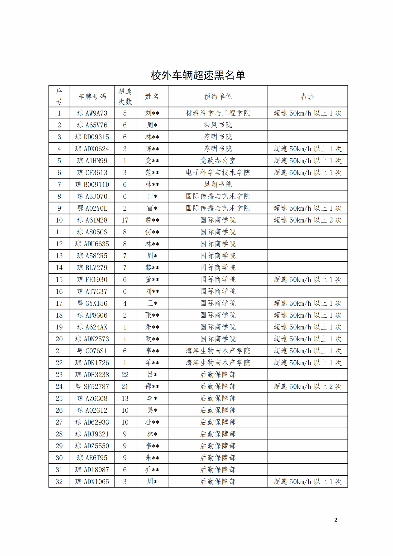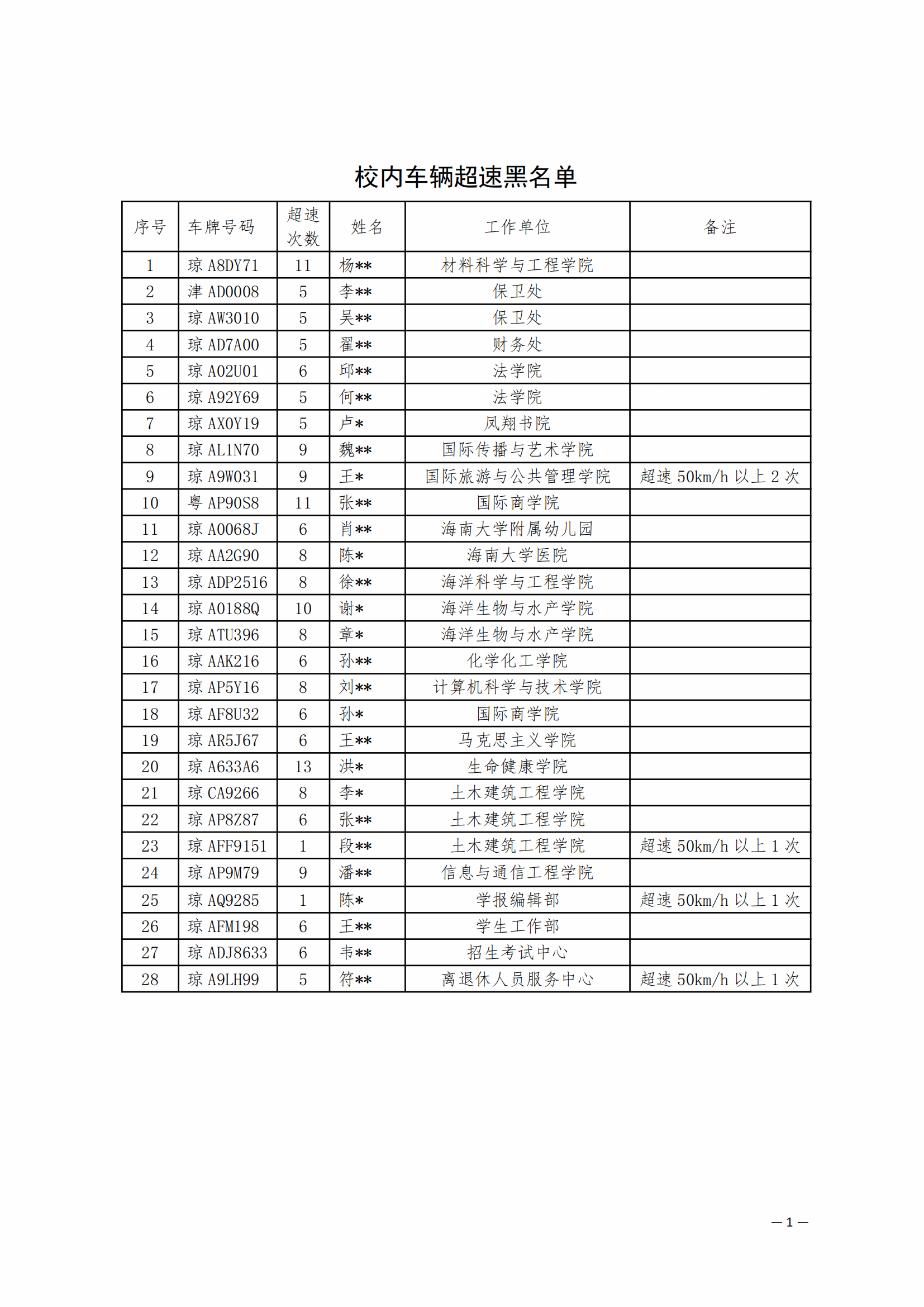 学校利用固定测速设备与移动测速仪,对校园内机动车辆进行速度监测。统计数据显示,本月共有3675辆(次)机动车出现超速行为,与上月同比超速数量呈上升趋势,交通安全形势严峻。有102辆机动车车速超过50km/h,其中最高车速高达70km/h。此类严重超速行为对广大师生的生命安全构成了极大威胁。根据校园交通管理相关规定,学校将严格按规定对累计三次速度超过30km/h或单次超速超过50km/h的车辆,实施黑名单管理(详细名单见附表)。