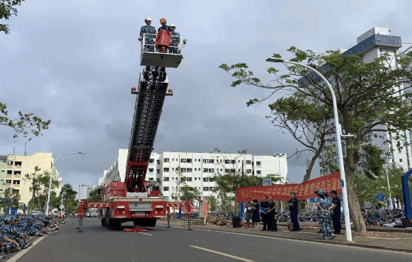 接着,由消防指战员讲解消防安全理论知识、火灾初期时的逃生方法与注意事项等,演示灭火器材操作方法,并邀请新生体验救援云梯车。