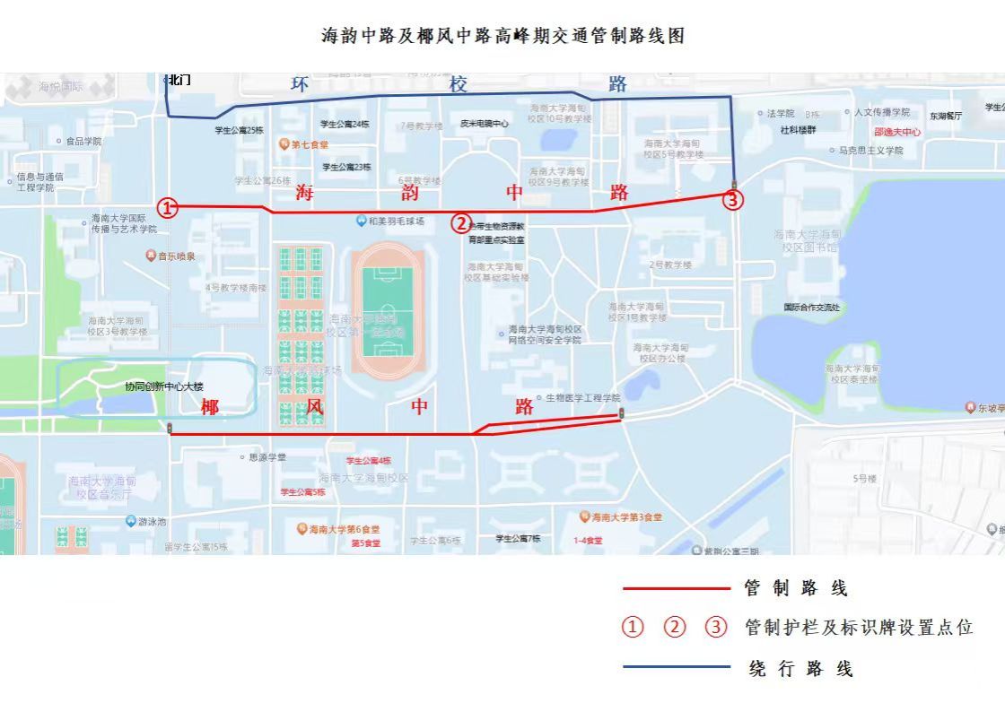 平安美丽校园建设是大家共同的责任,每天学生上下课期间,学校海韵中路和椰风中路两条主要道路的多个路口短时间形成人流高峰期。第三、四、五号教学楼到学生宿舍核心区之间多个路口集中通行的学生瞬时超过上万人,时间持续10多分钟。为确保师生通行安全提高步行和机动车通行效率,结合实际情况,部分路段和时段的交通管制措施进行优化调整错峰通行。现将具体事项通知如下: